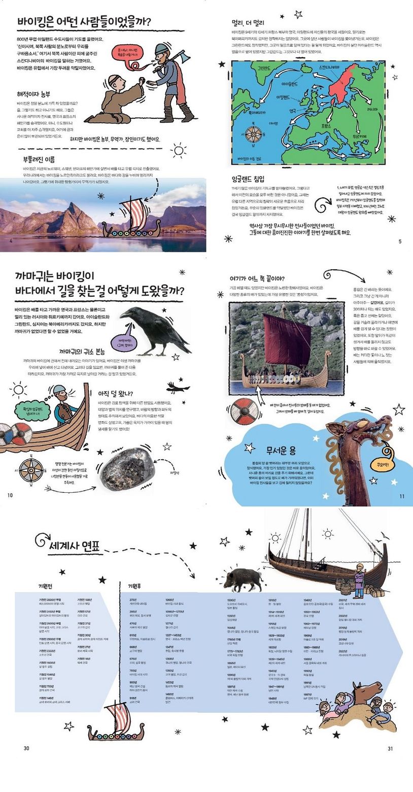 엉뚱한 질문을 통해 우리가 몰랐던 바이킹에 대해 알아보아요. ‘바이킹은 최초의 친환경적인 전사들이었을까?’에서는 바이킹이 살았던 곳의 자연환경을, ‘까마귀는 바이킹이 바다에서 길을 찾는 걸 어떻게 도왔을까?’에서는 바이킹의 지혜를, ‘왜 바이킹은 배를 땅에 묻었을까?’에서는 바이킹의 문화를 알 수 있답니다. 이 밖에 바이킹의 예술, 사회, 생활 모습, 문화유산 등이 담긴 엉뚱한 질문도 있어요. 우리 함께 바이킹 시대로 들어가 보아요!
