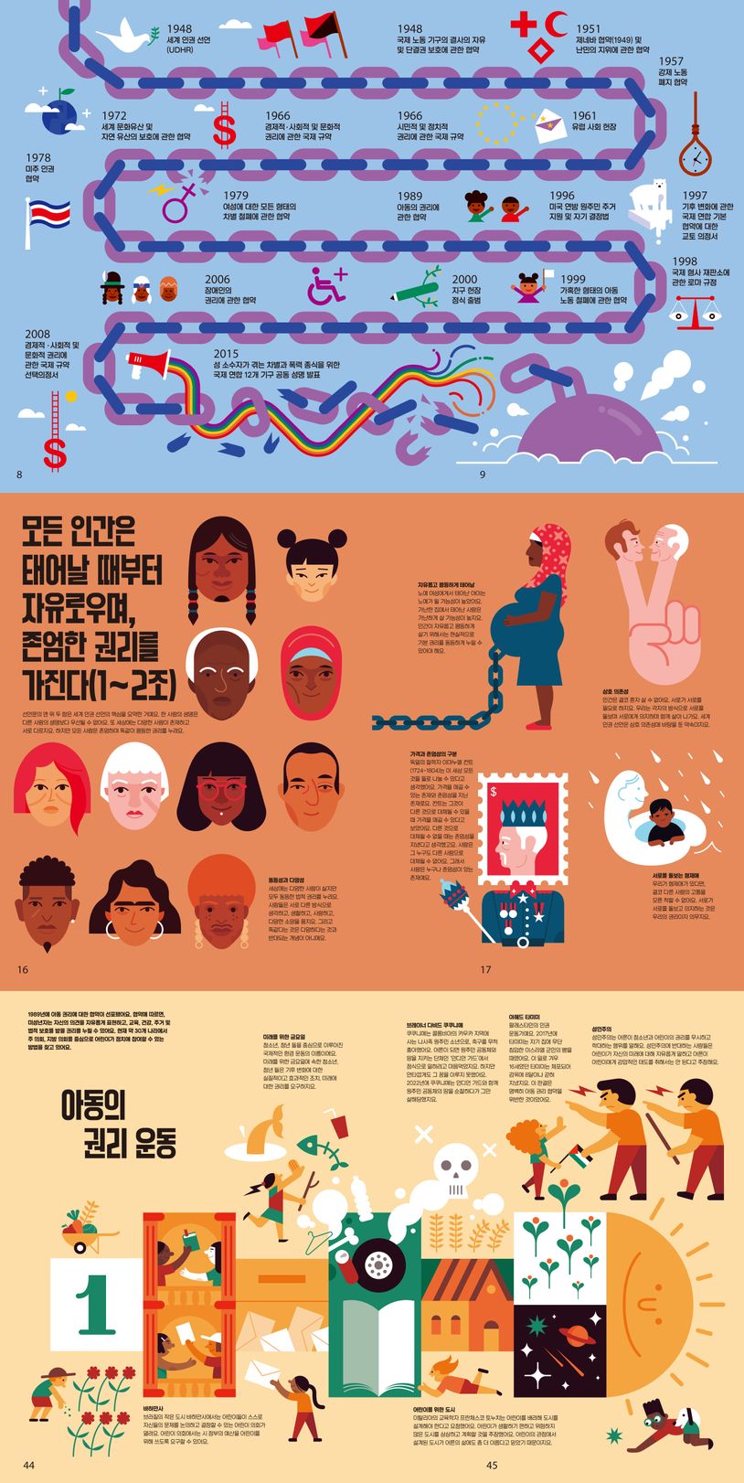 인권은 인간이 태어날 때부터 저절로 주어지는 기본적이고 절대적인 권리예요. 우리는 늘 존중받아야 하고, 또 우리가 존중받는 데는 다른 어떤 자격이나 이유가 필요 없지요. 우리가 어디서 태어났든, 어떤 성별이든, 어떤 피부색이든 전혀 상관없어요. 돈이 있든 없든, 어떤 종교를 믿든 또 믿지 않든, 두 발로 걷든 휠체어를 타든, 뚱뚱하든 말랐든, 나이가 많든 적든, 누구를 사랑하든 우리는 모두 특별하고 소중해요! 그 누구도 우리의 인권을 빼앗을 수 없지요. 인권은 어떠한 경우에도 다른 사람에게 양도할 수 없어요.
