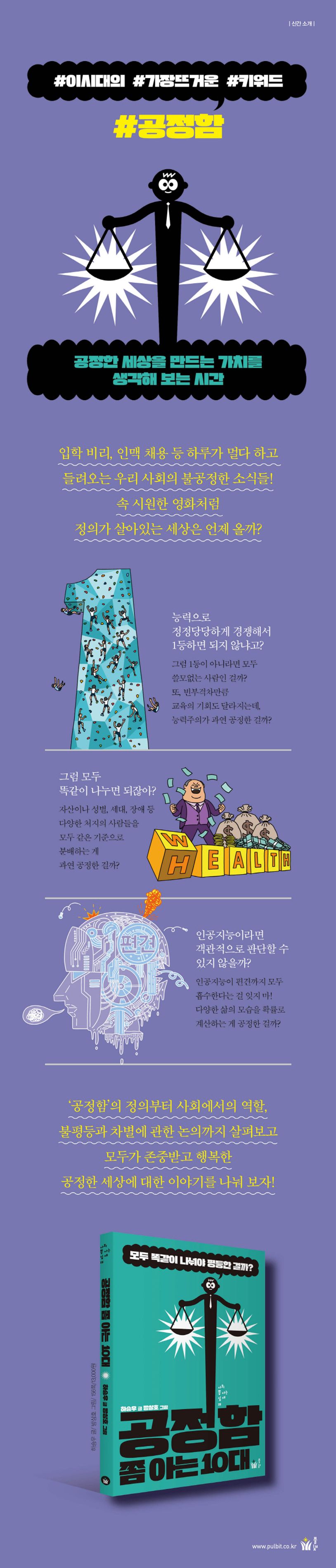 ‘능력’과 ‘노력’으로 대표되는 ‘능력주의’는 정상에 오른 사람의 결실을 의미하기도 하지만, 그 아래의 대다수 사람들을 ‘노력하지 않은 게으른 사람’ 또는 ‘부족한 사람’이라는 틀에 가두는 기준도 되었다. 1등을 하지 못하면 능력이 없는 걸까? 1등의 기준은 누가 정하는 걸까? 《공정함 쫌 아는 10대》는 공정함의 기준에 대한 새로운 질문을 던진다. 모두가 똑같이 나누고 능력으로 평가하는 것이 공정이 아니라, 모두가 각자의 가치로 존중받고 행복할 수 있는 사회가 공정한 사회임을 일깨워준다. 그리고 그 가치는 우리 스스로 만들어 가야 한다고 강조한다.