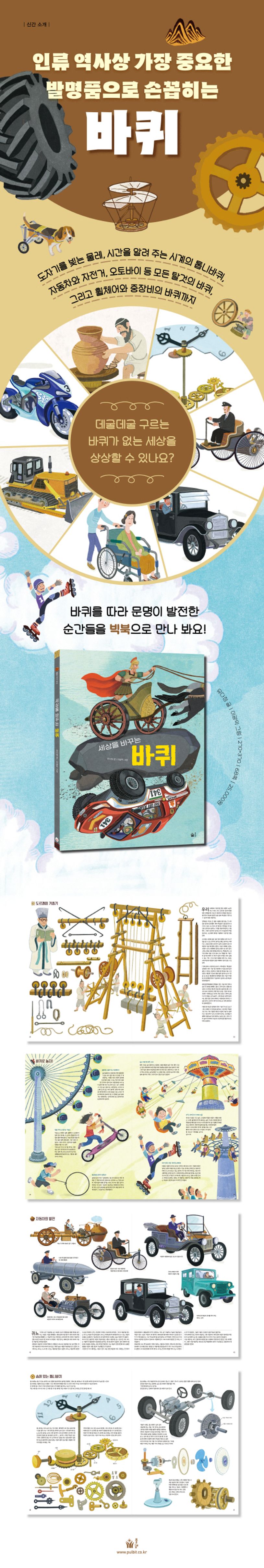 도자기를 빚는 물레부터 짐을 실어 나르는 수레바퀴와 시간을 알려 주는 시계의 톱니바퀴, 거중기의 원리를 이용한 엘리베이터의 바퀴, 기차와 자동차, 자전거, 오토바이, 지하철 등 모든 탈것의 바퀴 그리고 공사장에서 무거운 돌을 들어 나르는 중장비의 바퀴, 몸이 불편한 사람들의 다리가 되어 주는 휠체어의 바퀴 등. 우리 삶 곳곳에서 바퀴가 열심히 굴러가고 있어요. 그런데 만약 이 모든 바퀴가 한순간에 사라진다면 어떻게 될까요? 아마 상상하기도 싫은 일들이 벌어질 것입니다. 자동차와 엘리베이터가 멈추는 건 물론이고 지금까지 인류가 바퀴를 구르며 일군 문명의 역사가 한순간에 사라져버릴 테니까요. 믿어지지 않는다고요? 그렇다면 지금부터 인류 역사에 바퀴가 어떤 영향을 끼쳤고, 바퀴와 함께 문명이 어떻게 발전했는지 함께 알아봅시다. 일반 그림책보다 커다란 판형으로 시원하게 그림을 보여 주는 《세상을 바꾸는 바퀴》를 읽으면서요.
