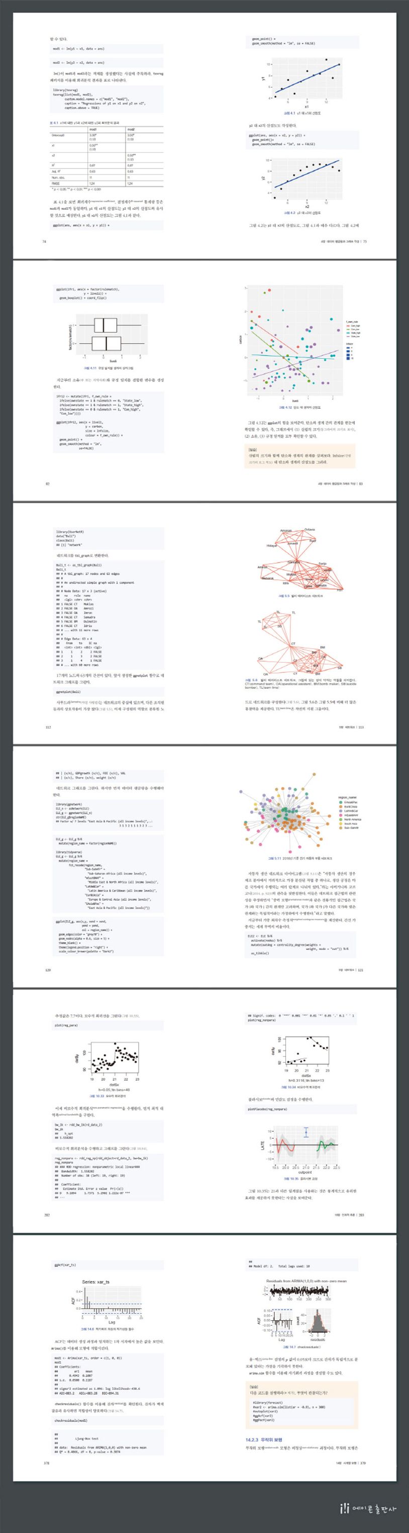 데이터 과학의 중심에는 데이터가 있으며, 이 책에서는 네트워크 데이터를 포함해 데이터를 가져오고 랭글링(wrangling)하는 방법을 설명한다. 또한 초반부부터 많이 사용하는 ggplot2 패키지를 이용해 데이터 시각화 작업을 살펴보며, 기본적인 지도도 작성해본다. 함수 이해, 차분방정식 시뮬레이션, 행렬 연산 수행에 R을 사용하는 방법도 다룬다. 이 책은 몬테카를로(Monte Carlo) 시뮬레이션을 사용해 확률과 통계적 추론(statistical inference)을 이해하며, 부트스트랩도 소개한다. 인과적 추론(causal inference)은 실험(experiment), 매칭(matching), 회귀 불연속(regression discontinuity), 이중차분법(difference-in-difference), 도구 변수(instrumental variable)를 다루는 실제 경제 예제와 함께 활용을 위해 시뮬레이션, 데이터 그래프, R 코드를 사용해 집중적으로 살펴본다. 성장과 관련된 데이터와 모형의 상호작용을 설명하며, 이후에 그래프, 시뮬레이션, 예제를 사용해 시계열 데이터 분석을 살펴본다. 마지막으로, 두 가지 계산 집약적 방법인 일반화 가법 모형(generalized additive model)과 머신러닝 분야에서 많이 사용하는 랜덤 포레스트(random forest)를 활용법과 함께 직관적으로 살펴본다.