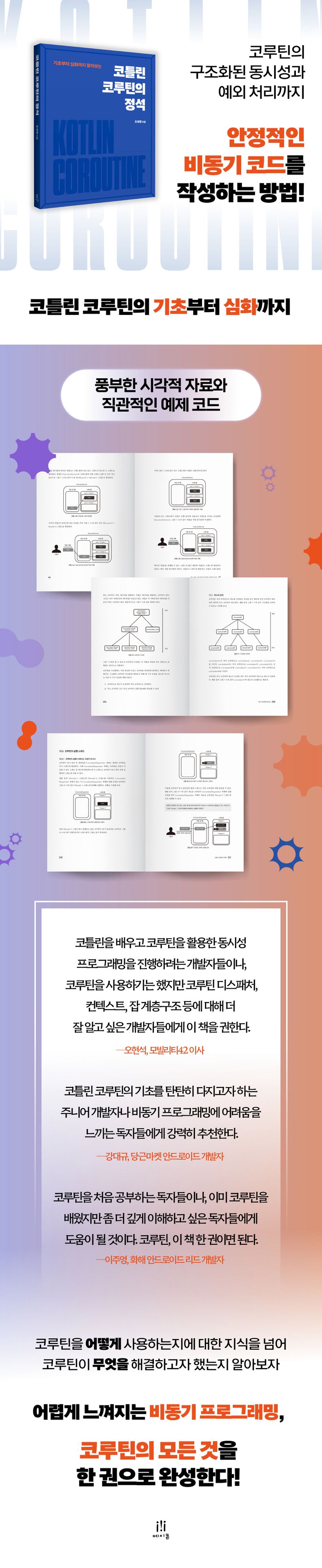 많은 개발자들이 어렵게 느끼는 비동기 프로그래밍을 다양한 시각적 자료와 이해하기 쉬운 설명을 통해 누구나 쉽게 이해할 수 있도록 설명한다. 안드로이드, 스프링 등 코틀린을 사용하는 개발자들 중 코루틴을 사용한 비동기 프로그래밍을 기초부터 심화까지 제대로 배워보고 싶은 독자들에게 추천한다.