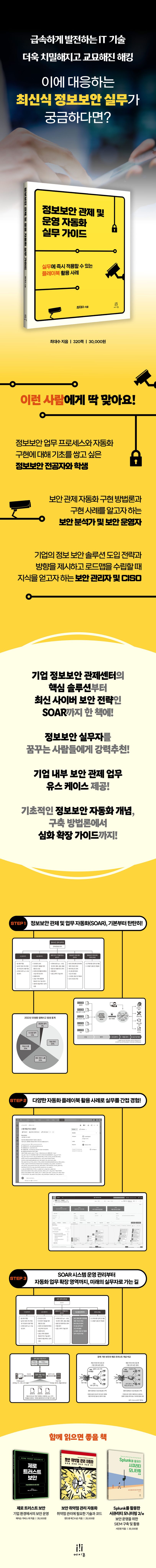 최근 기업의 정보보안 업무에 자동화 기술이 적극 활용되고 있다. 자동화 기술은 사이버 보안 전략인 제로 트러스트 구현을 위한 필수 요소 중 하나다. 보안 관제 자동화 솔루션(SOAR, Security Orchestration, Automation and Response)을 활용해 자동화 체계 구현 방법론과 유형별 구현 사례를 구체적으로 제시한다. 보안 관제 자동화 구축 실무를 직접 해보는 것과 같은 경험을 얻을 수 있고, 구현 사례를 응용해 각 기업에 맞는 활용 사례를 구성할 수 있다. 더 나아가서 정보보안 관제와 운영의 향후 로드맵 구성을 위한 인사이트를 얻을 수 있다.