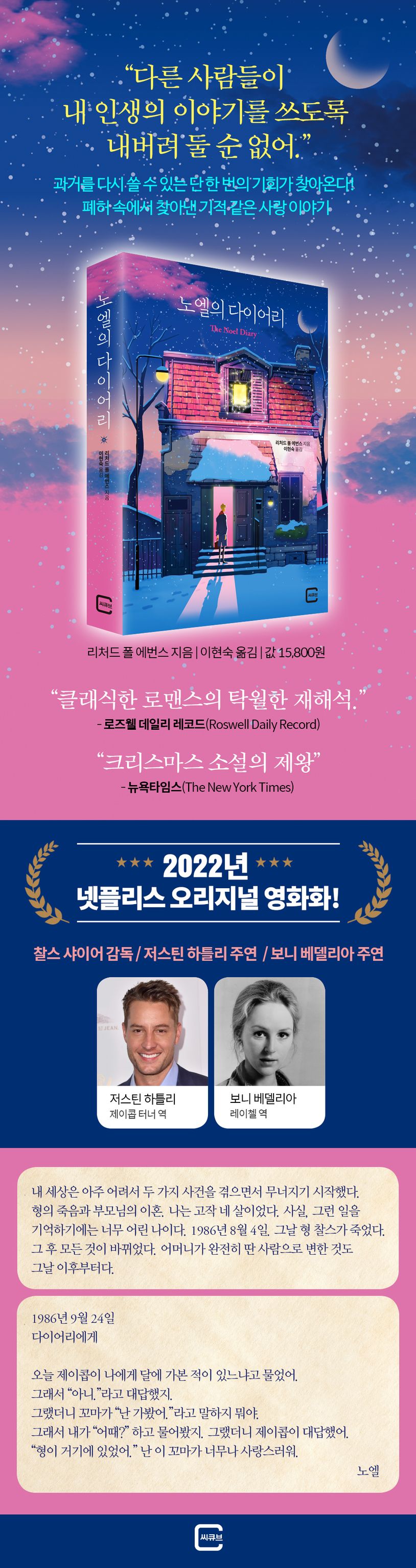 잔잔한 사랑 이야기로 전 세계에 수백만 독자를 거느린 베스트셀러 작가 리처드 폴 에번스의 ‘노엘 4부작’ 중 첫 번째 소설 《노엘의 다이어리》가 2022년 넷플릭스 오리지널 영화화 소식과 함께 국내에 출간되었다. 찰스 샤이어 감독이 메가폰을 잡고 저스틴 하틀리가 주연을 맡아 사랑에 늘 목마르지만 모든 인간관계에 시니컬한 태도를 견지하는 고독한 베스트셀러 소설 작가 제이콥으로 분한다.