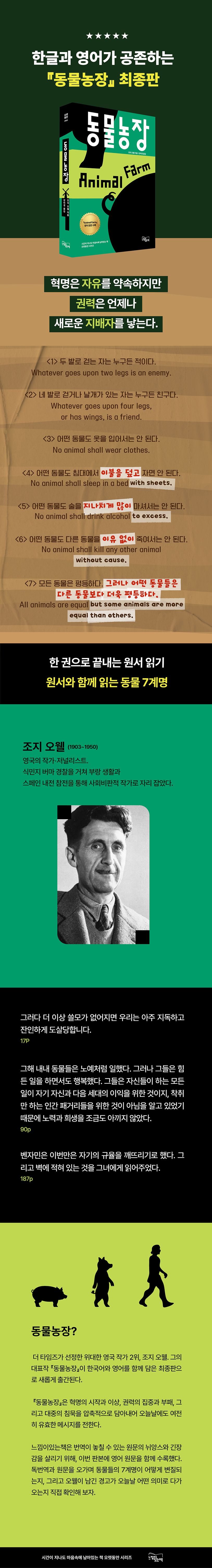 느낌이있는책은 번역이 놓칠 수 있는 원문의 뉘앙스와 긴장감을 전하고자 이번 판본에 영어 원문을 함께 수록했다. 번역본과 원문을 오가며 동물들의 7계명이 어떻게 변질되는지, 그리고 오웰이 남긴 경고가 오늘날 어떤 의미로 다가오는지 직접 확인해 보자.