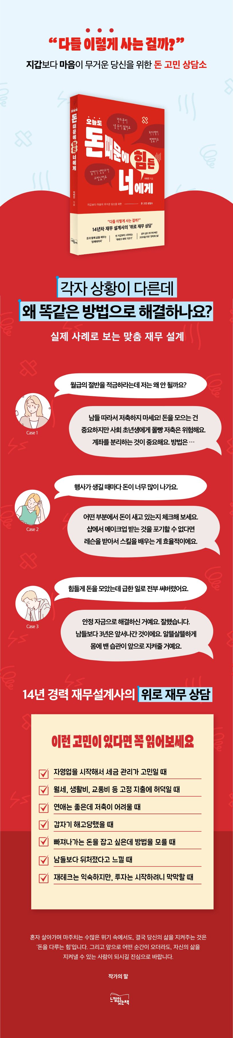 『오늘도 돈 때문에 힘든 너에게』는 화려한 투자 전략이나 고급 재테크 기술을 알려주는 책이 아니다. 돈을 더 버는 법이 아니라, 돈이 내 삶을 지배하지 않게 하는 법을 이야기한다. 예기치 않게 돈이 생겼을 때의 활용법부터 세금·대출·환율 관리, 퇴사·노후·불황 같은 현실적 위기에 대응하는 법까지, 우리가 외면해 온 돈의 문제를 구체적으로 풀어낸다. 그리고 다시 시작할 용기, 무너진 일상을 다시 세우는 힘을 건넨다.