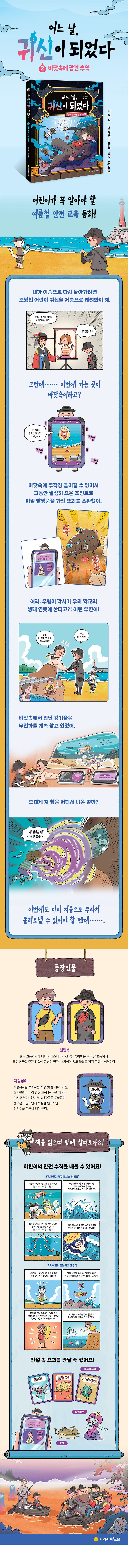 《어느 날, 귀신이 되었다 ②》는 어린이 저승사자로서 첫 번째 미션을 성공적으로 마친 주인공의 두 번째 이야기입니다. 앞 권과 마찬가지로 판타지와 현실 세계를 넘나들며 색다른 모험이 생생하게 펼쳐집니다. 두 번째 미션은 바닷가에서 사고를 당한 어린 지박령의 안타까운 사연과 함께 여러 요괴의 등장으로 박진감이 넘칩니다. 예로부터 전해져 내려오는 이야기 속 요괴와 현대적 상상력을 결합해 설계된 저승의 모습도 눈길을 사로잡습니다. 또 저승이라는 낯선 세계 안에서 열심히 적응해 나가는 주인공의 모습은 어린이에게 본보기가 되며, 여러 생각할 거리를 던집니다.
