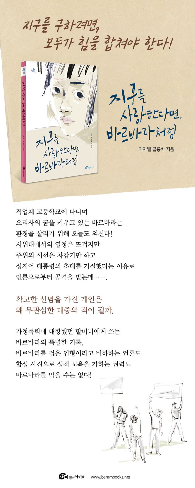 『지구를 사랑한다면, 바르바라처럼』은 청소년들도 정치 참여에 적극적인 프랑스를 배경으로 하고 있지만 이야기가 다루는 문제의식은 보편적이다. 가정 폭력이나 인종차별, 여성 혐오 같은 사회 문제는 국경을 가리지 않는다. 그리고 이러한 모든 폭력이 결국 기후 위기로까지 이어진다는 메시지는 우리 모두가 공유해야 할 것이기도 하다. 한국의 청소년들은 언제나 학업에 목매는 존재로 간주되곤 하지만, 오늘날 청소년들만큼 기후 문제에 관심이 있는 세대도 없을 것이다. 어쨌거나 우리 청소년들은 어른들보다 더 오래 지구에 머무르며 살아가야 하니까. 어른들과 사회는 어린이 청소년들은 한발 물러나 있기를 바라지만 지구를 사랑한다면 그럴 수 없다. 우리는 당장 무언가 해야 한다. 이렇듯 『지구를 사랑한다면, 바르바라처럼』는 시위를 통해 연대와 협력의 아름다움에 대해 이야기하는 작품이다.