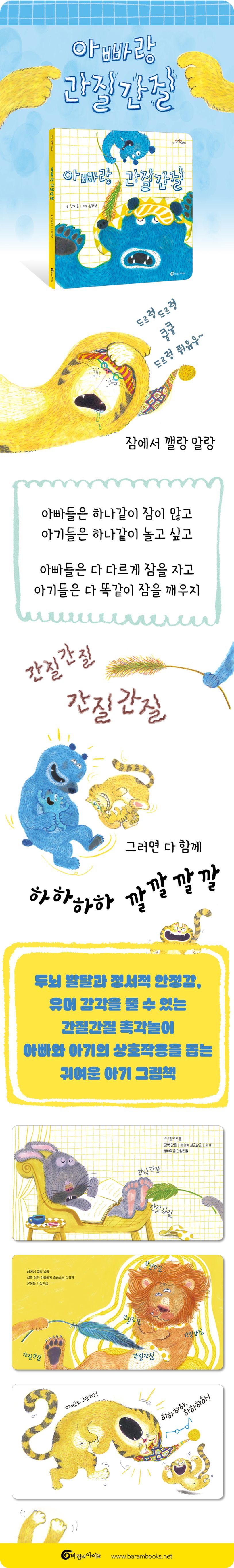 아빠 고양이와 아기 고양이, 아빠 곰과 아기 곰, 아빠 사자와 아기 사자도 차례차례 등장해 똑같이 간지럼을 태우고 똑같이 웃음을 터뜨린다. 깊이 잠들거나 잠이 들락 말락 하거나 양말을 벗어 던지고 뻗어 있거나 얌전히 수면안대를 쓰고 있거나 아빠들의 잠버릇은 저마다 다르지만 간지럼은 공평하다. 간질간질 간지럽히면 잠에서 깨어나 하하 호호 신나는 간지럼 놀이가 시작된다! 그런데 가만, 간지럼을 태우는 건 아빠가 아니라 아기들이다. 아기 동물들은 어째서 아빠에게 다가가 간지럼 세례를 퍼부었을까?