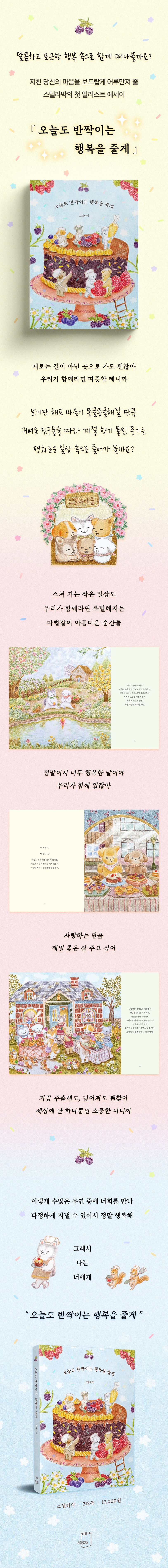 특별하진 않아도 항상 곁에 있는 것들에서 행복을 찾고 싶다면, 이 책을 펴고 가장 향긋한 마을로 발걸음을 옮겨 보세요. 사랑스러운 친구들과의 시간 속에서 위안을 새긴다면 갓 구워진 빵처럼 고소하고 기분 좋은 하루가 될 거예요. 깜찍한 친구들이 만끽하는 어느 휴가 같은 사계절의 장면들이 당신에게, 그리고 당신이 가장 아껴주고 싶은 이의 마음에 꽃비처럼 내려앉아 힐링을 선물합니다.
