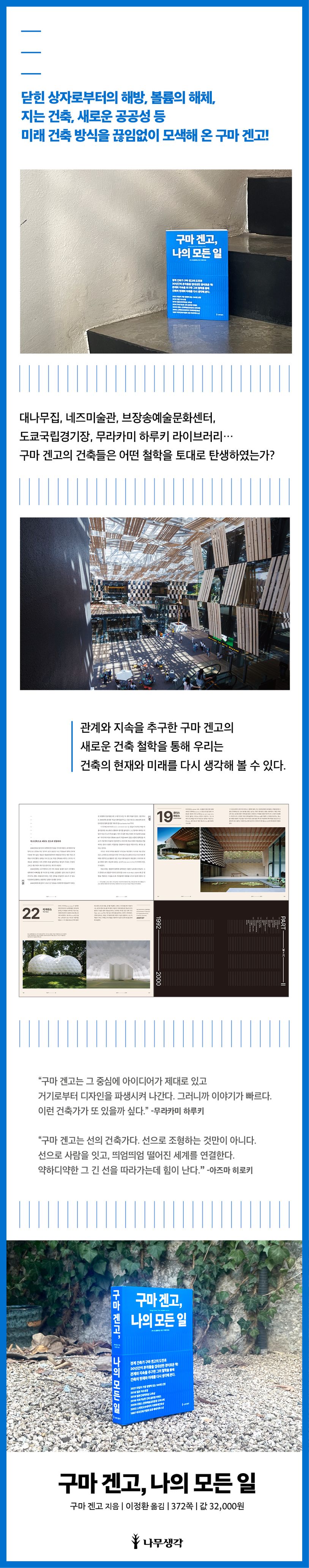 《구마 겐고, 나의 모든 일》에는 공업화 시대와 탈공업화 시대의 경계를 타넘으면서도 구마 겐고가 지치지 않고 장거리 주자처럼 비슷한 속도로 꾸준히 달려올 수 있었던 비밀이 담겨 있다. 건축가로서의 첫 걸음을 시작한 1986년부터 최근의 생각과 활동까지를 총 네 기간으로 나눈 뒤, 그의 생각들이 어떻게 변화되고 발전되어 왔는지, 삼저주의를 표방하던 그의 사상이 어떻게 작품으로 실현되고 완성되었는지를 세세히 보여주고 있다. 이례적으로 그가 직접 선별하여 수록한 55개의 작업물에 대한 에피소드들이 사진과 함께 수록되어 있다. 한마디로 구마 겐고의 집대성이다.