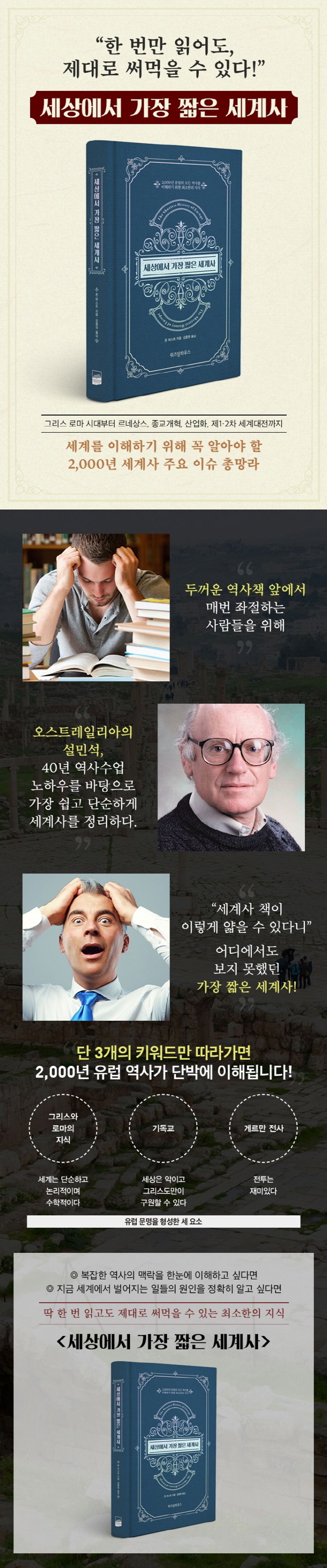 [세상에서 가장 짧은 세계사]는 그리스 로마 시대부터 20세기 현대 유럽까지 2,000년 유럽의 모든 역사를 단박에 이해하기 위한 최소한의 지식을 담았다. 오스트레일리아에서 가장 존경받는 역사학자가 40년간의 역사 수업 노하우를 바탕으로 가장 쉽고 단순하게 세계사를 정리해 복잡한 세계사를 한눈에 파악하고 싶은 사람들에게 길잡이가 되어 줄 것이다.