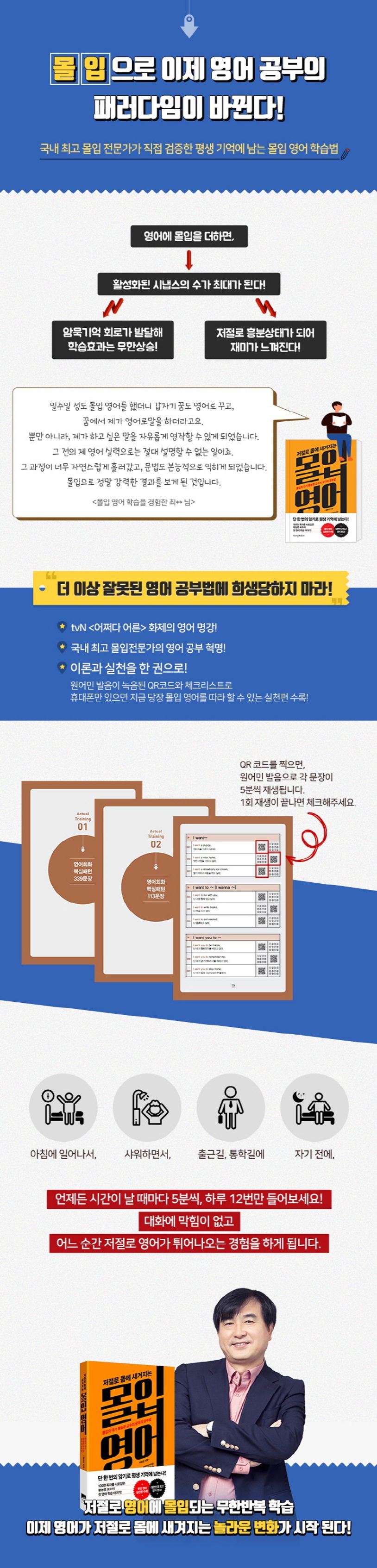 아침에 일어나서, 샤워를 하면서, 출근길 혹은 통학길에, 자기 전에 무한반복 학습으로 영어 회화의 머뭇거림을 사라지게 하고, 영어를 삶의 일부로 만들 수 있도록 이끌어준다. 효율적인 영어 공부를 돕기 위해 저자가 직접 골라 추천한 ‘영어 공부에 도움이 되는 유튜브 채널’을 비롯하여 원어민 회화 QR코드가 담긴 몰입 영어 실천편을 수록해 이론과 실천을 한 권으로 해결할 수 있도록 했다.