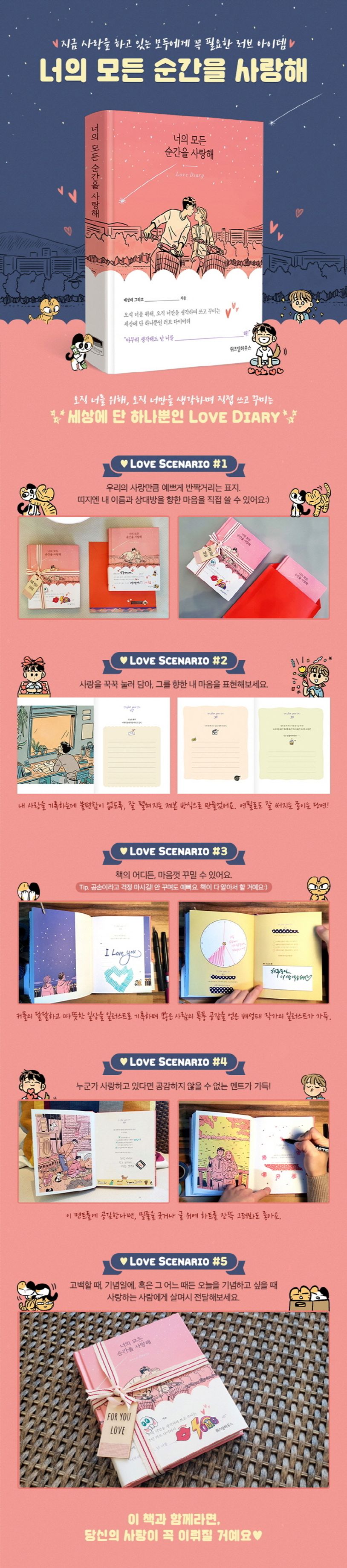 커플의 달달하고 따뜻한 일상을 일러스트로 기록하며 많은 이들로부터 ‘이 그림 꼭 우리 이야기 같아’ ‘너랑 내 모습 같아’ ‘나도 너랑 저렇게 사랑하고 싶어’ 등의 폭풍 공감을 얻은 배성태 작가. 배성태 작가가 사랑을 시작하는, 사랑을 완성해가는 연인들을 위해 『너의 모든 순간을 사랑해 : Love Diary』를 그리고 썼다. 이 책에는 사랑의 여러 순간들을 포착한 감각적이고 따뜻한 그림과 함께 100개의 질문과 글이 실려 있다. 하루에 질문 하나씩, 혹은 하루에 몇 장씩이라도 좋다. 사랑하는 사람과의 추억을 되새겨 보거나 앞으로 함께 만들어갈 사랑의 모습들을 계획하다 보면 오직 너를 위해, 오직 너만을 생각하며 쓰고 꾸미는 세상에 단 하나뿐인 책이 완성될 것이다.