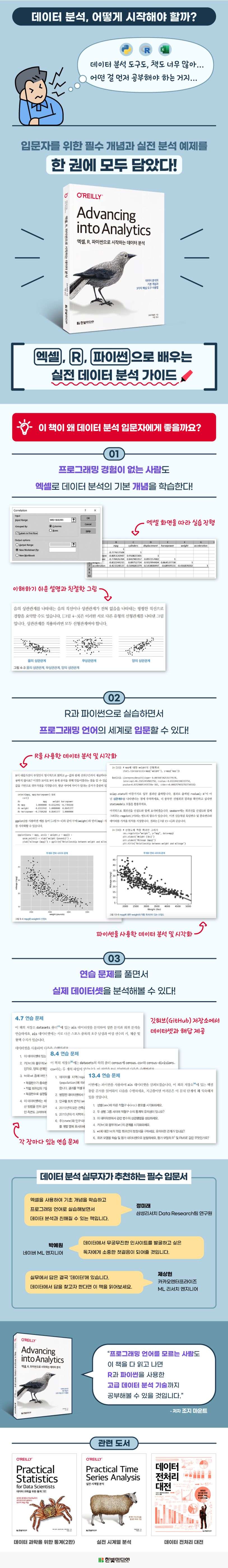 이 책은 기본적인 데이터 분석과 데이터 분석 스택을 확실히 이해할 수 있는 개념서입니다. 엑셀뿐 아니라 프로그래밍 언어인 R과 파이썬을 사용하여 탐색적 데이터 분석 및 가설검정 방법을 익힐 수 있도록 안내합니다. 엑셀에 익숙하다면 자연스럽게 프로그래밍의 세계에 입문하고, 프로그래밍 언어에 익숙하다면 데이터 분석의 개념과 구현 방법을 살펴볼 기회를 얻을 수 있습니다. 스프레드시트로 주요 통계 개념을 익히고, 데이터 조작의 개념을 R과 파이썬 프로그래밍에 적용하며, 책에서 소개하는 도구와 프레임워크를 고급 데이터 분석 기술에 활용해볼 수 있습니다.