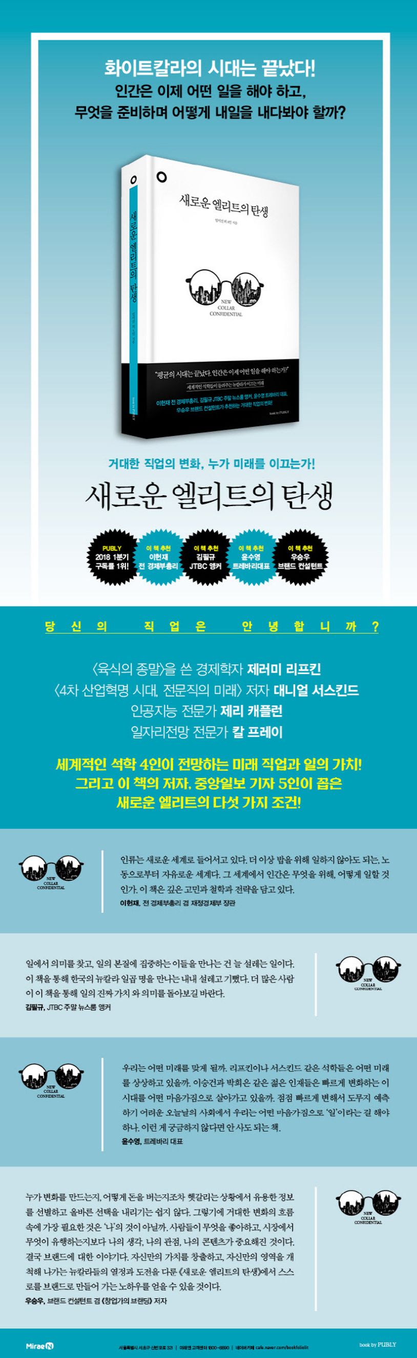 고수들은 다르다. 단순한 질문이지만, 일의 미래를 오래 고민해 온 '고수들의 답'은 달랐다. 대니얼 서스킨드, 칼 프레이, 제리 카프란, 제레미 리프킨 등 해외의 석학을 만났고, 일의 변화가 진행 중인 세계 곳곳의 현장도 찾았다. 그리고 한국의 뉴칼라 일곱 명을 만났다. 누구도 묻지 않은 걸 물었고, 쉽게 들을 수 없는 이야기를 들었다. 저자들이 꼽은 뉴칼라의 다섯 가지 조건과 한국의 뉴칼라로 선정된 7인을 주목하라! 한 권 으로 읽는 흥미로운 직업의 변화. 인공지능, 제4차 산업혁명, 미래 직업에 대한 책은 많지만 《새로운 엘리트의 탄생》만큼 다양한 현안을 가진 책은 없다.