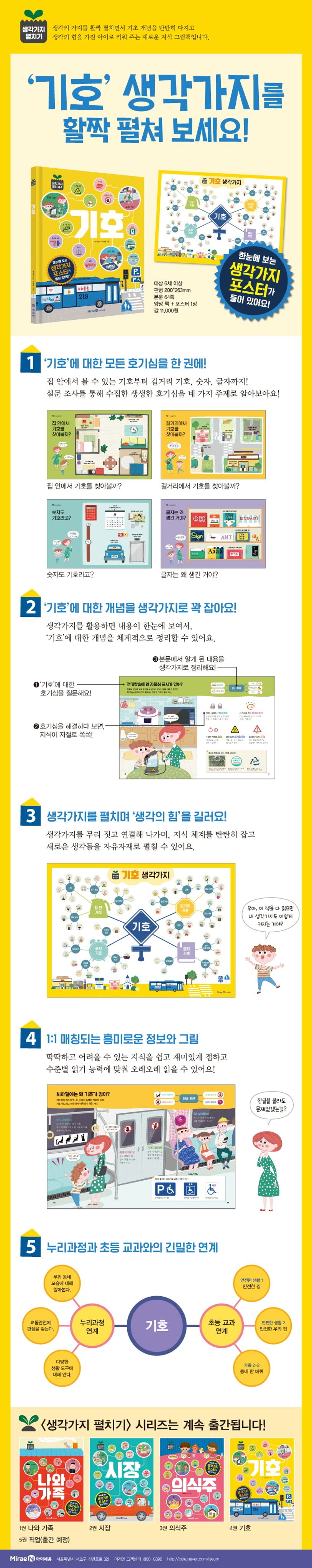 [생각가지 펼치기] 시리즈의 네 번째 권인 《기호》는 ‘기호’에 대한 모든 호기심을 생각가지로 꽉 잡아 주는 지식 그림책이에요. 설문 조사를 통해 수집한 ‘기호’에 대한 아이들의 생생한 질문을 ‘집 안 기호, 길거리 기호, 숫자, 글자’ 네 가지 주제로 알아보고, 알게 된 정보를 생각가지로 정리해 보세요. 생각가지를 활용하면 딱딱한 정보도 기억이 쏙쏙, 개념도 체계적으로 정리할 수 있어요. 벽에 붙여 놓고 볼 수 있는 ‘한눈에 보는 생각가지 포스터’도 들어 있어요.
