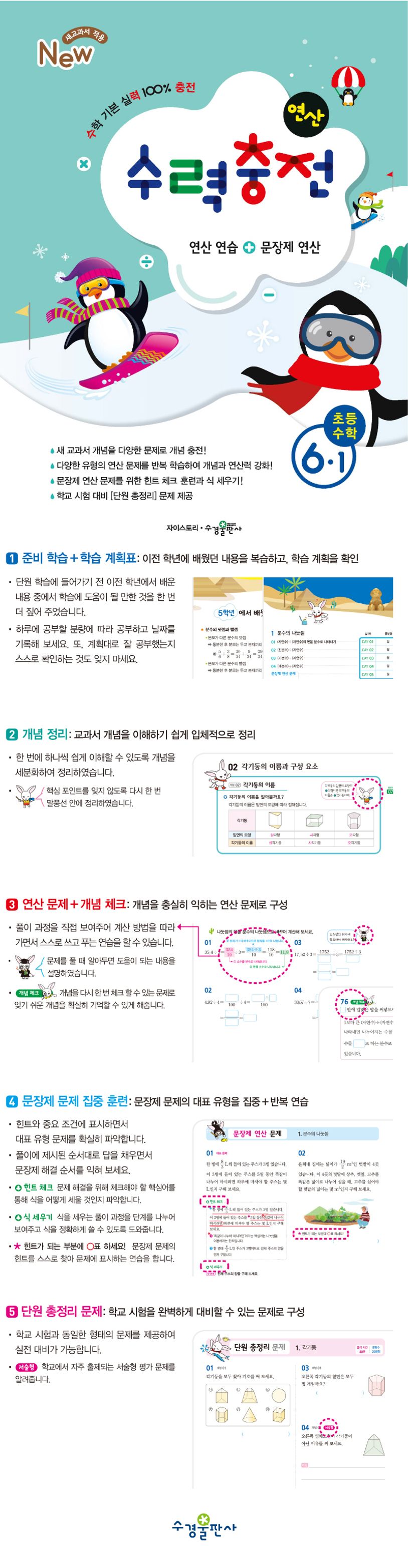 ㆍ준비학습+학습계획표이전에배웠던내용을간략하게복습하고,공부할분량을확인해서학습계획표를세울수있도록하였습니다.ㆍ개념정리교과서개념을더쉽게이해하고입체적으로정리할수있도록세분화하여정리하였습니다.ㆍ연산문제+개념체크개념을충실히익히는아주간단하고쉬운연산문제로구성하였습니다.개념을잊지않기위해개념을다시한번더체크할수있도록하였습니다.ㆍ문장제연산문제가장많이어려워하는문장제문제를대표유형을통해집중해서풀어보고,반복연습할수있도록구성하였습니다.힌트체크를통해서문제에서체크해야할핵심어를찾는연습을확실히할수있을것입니다.ㆍ단원총정리문제학교시험을대비할수있도록동일한형태의문제를통해실전대비가가능하도록구성하였습니다.