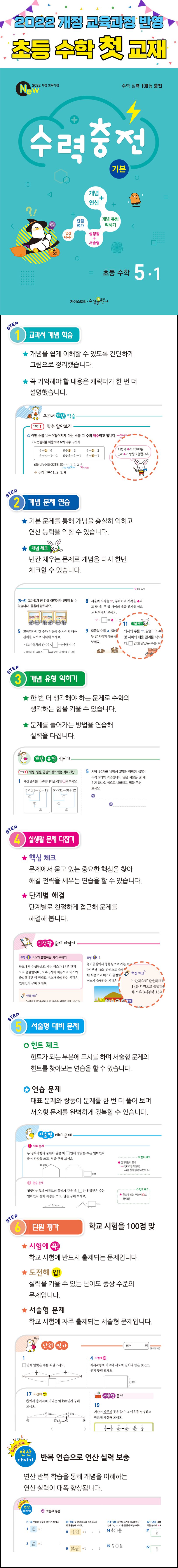 똑같은 연산만 반복적으로 공부한 학생은 문제가 조금만 바뀌어도 개념을 활용하지 못해 틀리기 쉽습니다. 그렇기 때문에 수학 기본 개념에 대한 이해를 바탕으로 꾸준히 문제를 풀어야 합니다. 수력충전은 하루 1개 개념을 다양한 유형의 문제로 익혀 수학의 기본 실력을 탄탄히 키워 줍니다.