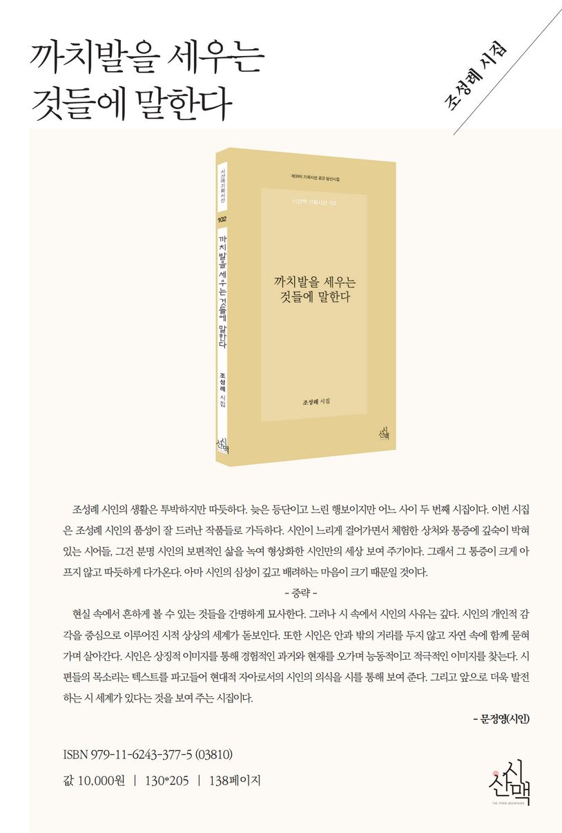 1부찰나아주작은유언 20첫사랑 22괴산장날어물전에서읽는간고등어의순애보 24면벽수행 25선산휴게소의어머니 26봄을걷다 27허공을흔드는것들 28石花 30바람의터 32기침과동거하다 34불모 35땅따먹기그이후 36한잎의이파리인걸 382부초경 41단물을리필하다 42그사내의변증법 44주전자속으로내리는비 46그남자의만남 48폭염 50압화 52파장에서돌아보네 54푸른도둑질 55화롯불 56프리티우먼 58동면 59역방향으로가는여행 60폭우 613부탈수 65어느풍경 66적막이누워있는오후 68하루살이 70엑스레이 72지금은코스모스가흔들리는계절 74어머니의꽃밭 76국수를삶으며 78기다림은아프다 80홍수 81풀벌레가잠자는고독을깨웠다 82가위질 84자벌레 86조치원 884부까치발을세우는것들에말한다 93달이사는동네 94통증은허기를몰고온다 96우아한그녀 98가족사진 100발효중 102검정고무신 103세월을담는다 104즐거운제사 106생각이라는궁금증 108시간을사다 109골동품도되지못하는것들이 110계절을옮기다 112실크로드로가는길 114■해설|문정영(시인)117