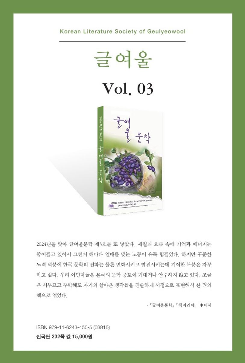 추천글2024년을맞아글여울문학제3호를또낳았다.세월의흐름속에기억과에너지는줄어들고있어서그런지해마다열매를맺는노동이유독힘들었다.하지만꾸준한노력덕분에한국문학의진화는물론변화시키고발전시키는데기여한부분은자부하고싶다.우리이민자들은본국의문학풍토에기대거나안주하지않고있다.조금은서투르고투박해도자기의살아온생각들을진솔하게서정으로표현해서한권의책으로엮었다.지금까지많은분이글여울반에서열심히읽고쓰고생각했다.그렇게배우면서발전해나가는시니어들을보며감사하고있다.열정또한젊은이들못지않기에글의완성도가튼튼하다.하지만때로는실험성에대한예민한자의식으로잠시글을쓰지못하는슬럼프를겪기도한다.그러나곧털고일어나창작의깊숙한속으로들어오기때문에글여울반여러분들에게격려의박수를계속보내고싶다.-책머리中에