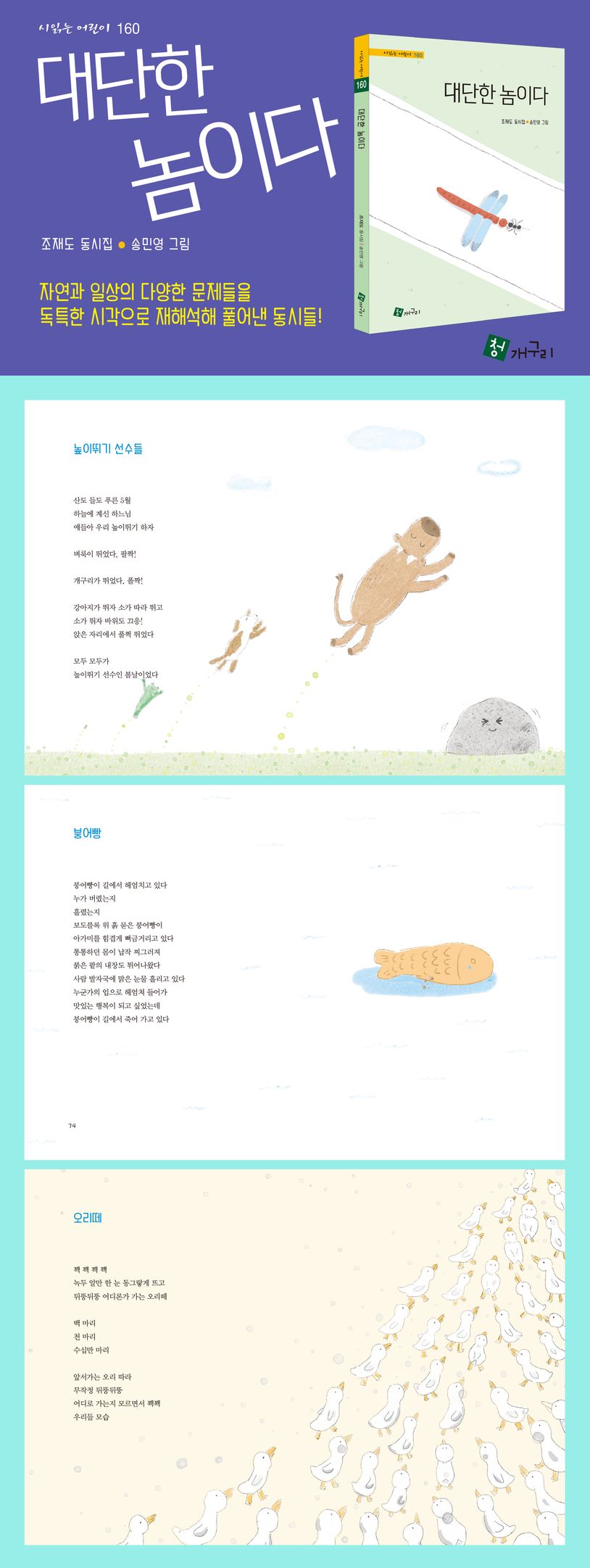 조재도 시인의 첫 동시집. 무려 10년 동안 써온 동시들을 묶으면서 시인은 “세상의 모든 어린이는 그 사회 속의 어린이이고 또 그 나이에 맞는 발달과정에 있는 어린이이기에, 동시 속에 그 성장의 비탈에 있는 어린이들의 처지를 담으려고 노력”했다고 고백한다. 이 시집에서 ‘자연’과 ‘인간’은 대립적이지만 ‘자연’과 ‘어린이’는 다르다. 어린이는 자연을 닮았기 때문이다. 새장에서 벗어나 자연을 느끼고 자연에서 생명의 이치와 생명의 소중함을 깨닫는 진정한 성장을 경험할 ‘대단한 어린이들’을 기대하게 하는 동시집이다.