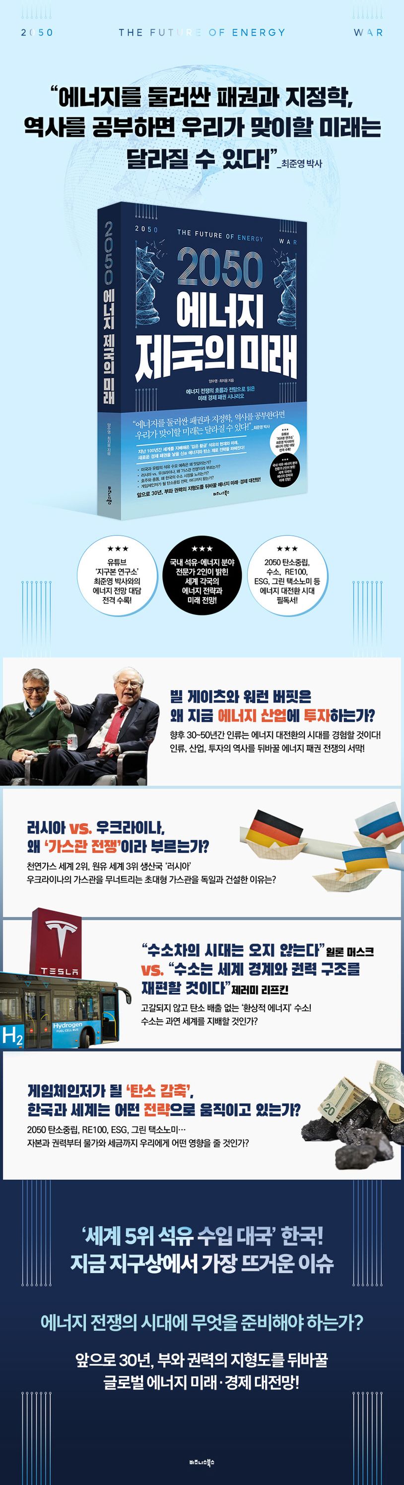 《2050 에너지 제국의 미래》의 저자들은 “향후 30~50년간 인류는 어떤 형태로든 에너지 분야에서 큰 변화를 겪을 것”이라고 말한다. 석유·가스 분야를 비롯해 에너지 산업 전반에 걸쳐 현장에서 바라본 석유의 어제와 오늘, 그리고 미래에 대해 들려준다. 석유는 여전히 일상의 많은 것을 결정하고 만들고 있지만, 과거와 달리 인류의 당면 과제로 떠오른 기후변화 대응을 위해 새로운 에너지원으로의 전환은 불가피하다고 강조한다. 이를 위해 현재 대체에너지로 주목받는 재생에너지와 가장 관심 높은 ‘수소’에 대해 이야기하며 이 에너지원들의 가능성과 한계, 주변국 및 유럽의 활용 사례를 살펴본다.