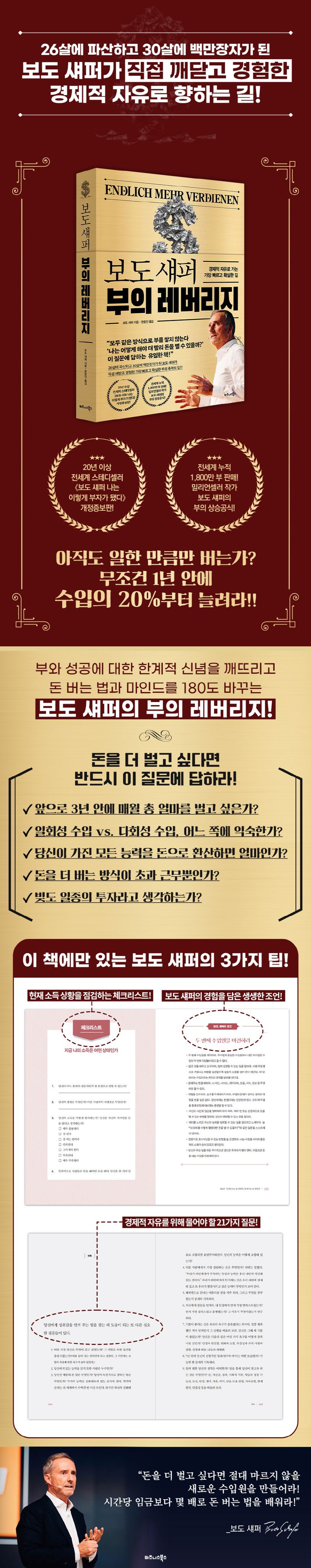 20년 전, 보도 섀퍼가 자신이 어떻게 완전한 경제적 자유를 이뤘는지 밝힌 저서가 업그레이드된 부의 공식과 마인드셋을 더해 개정증보판으로 돌아왔다! 26살에 모든 것을 잃고 단 4년 만에 수입의 ‘이자’만으로 평생 먹고살 수 있을 만큼 압도적 부를 이룬 그의 경제적 노하우와 부의 공식이 이 책에 모두 담겨 있다.