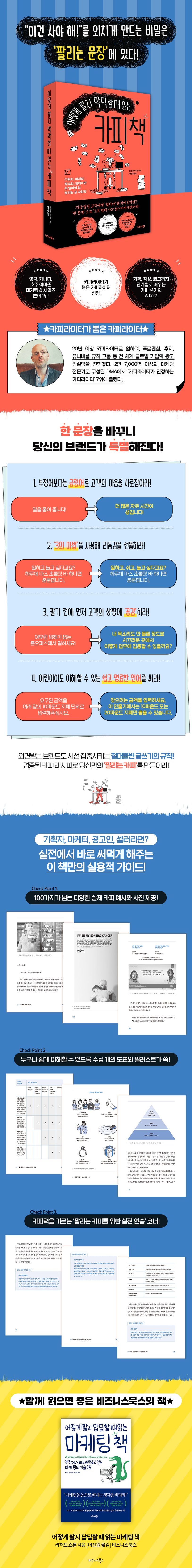 이 책은 기획부터 작성, 퇴고까지 감동과 탄성을 만들어내는 3단계 카피 공식을 담았다. 100가지가 넘는 카피 예시와 실제 광고 사진을 살펴보면서 자신의 제품이 특별해지는 글쓰기 공식을 배울 수 있을 것이다. 또한 다양한 도표와 일러스트가 실려 있어 누구나 쉽고 빠르게 내용을 이해할 수 있다. 각 장의 끝 부분에는 ‘팔리는 카피를 위한 실전 연습’ 코너가 있어 일상에서 ‘팔리는 포인트’를 발견하고 자신의 브랜드를 돋보이게 만드는 방법을 찾아본다.