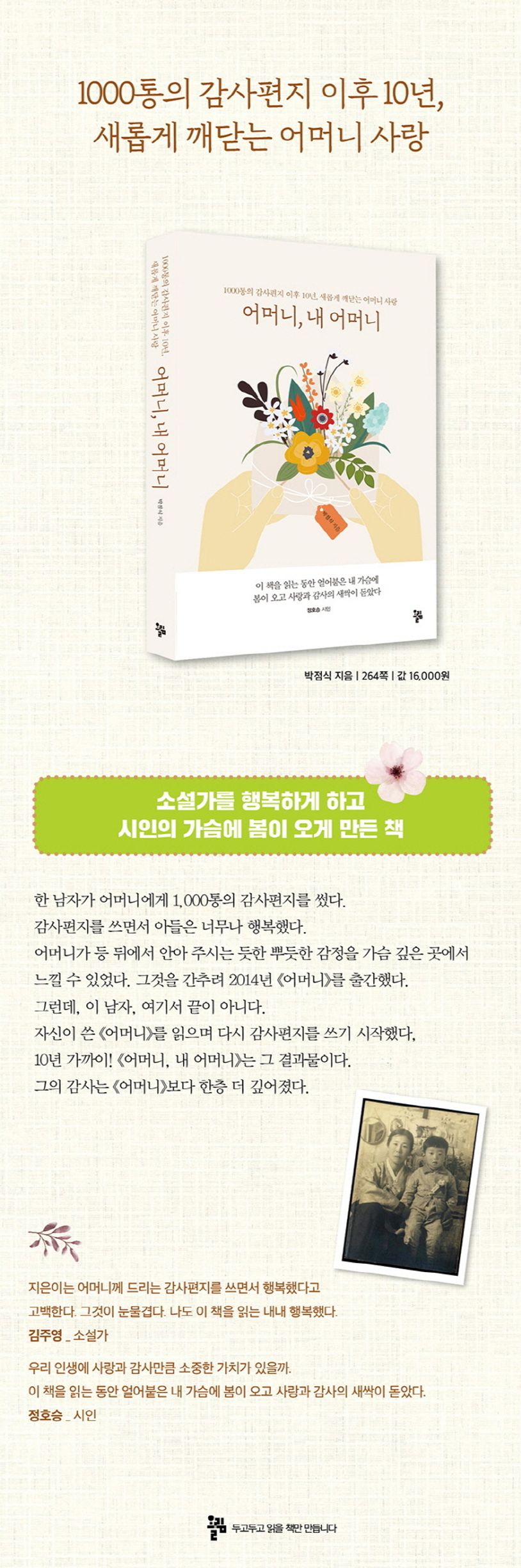 630통을 썼을 때 어머니가 세상을 떠나자 남자는 그것을 어머니 무덤에 넣어드렸다. 남자는 어머니를 추억하며 370통을 더 썼다. 감사편지를 쓰면서 아들은 너무나 행복했고, 어머니가 등 뒤에서 안아 주시는 듯한 뿌듯한 감정을 가슴 깊은 곳에서 느꼈다. 1000통의 감사편지를 간추려 2014년 《어머니》를 출간하고 다시 어머니 묘소에 책을 바쳤다. 《어머니》는 많은 사람들의 공감을 얻었고, 여러 언론매체들이 앞다투어 소개했다.