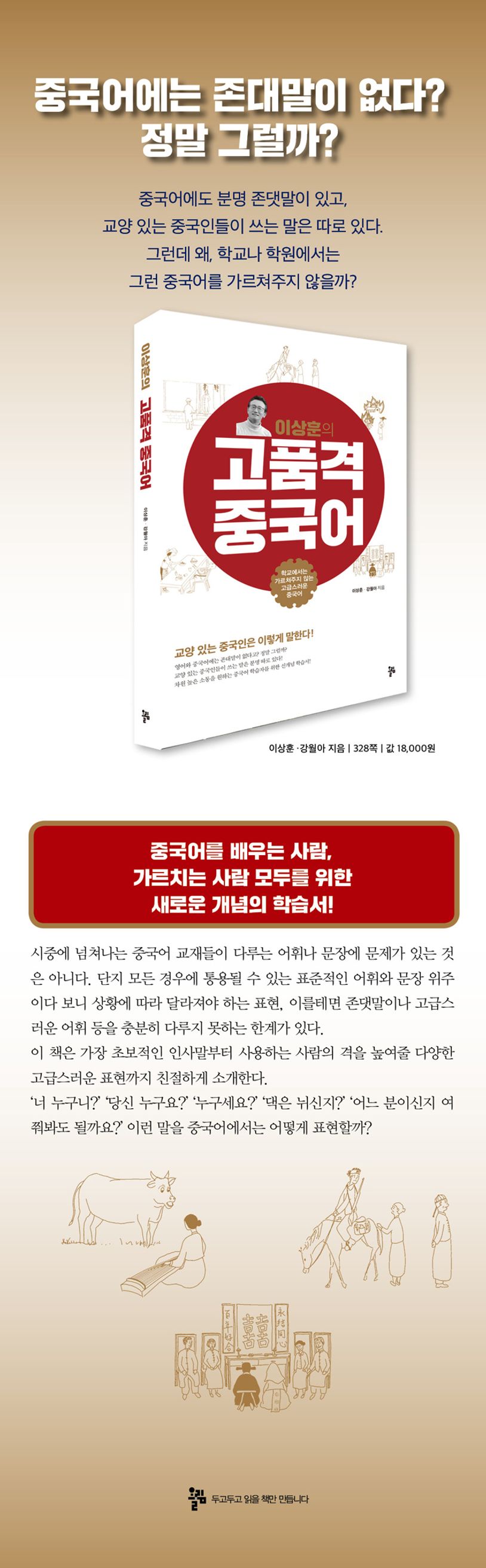 저자 이상훈은 한국인들이 반말투 혹은 교양 없는 중국어를 쓰는 것을 볼 때마다 ‘격조 있는 좋은 표현이 있는데, 왜 저렇게 말할까?’ 하는 생각에 안타까웠다. 교양 있는 중국인들이 쓰는 말은 분명 따로 있는데, 왜 학교에서는 그런 중국어를 가르치지 않을까?