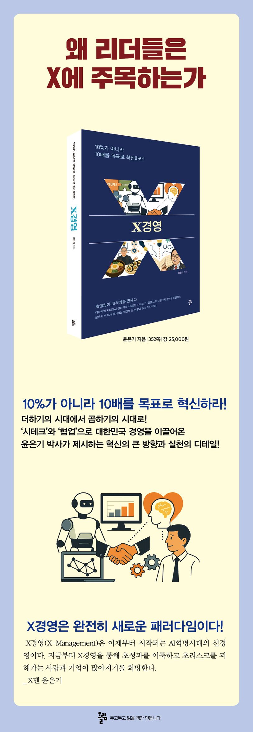 교육자,체육인,예술후원가,방송인,칼럼니스트,기부자,그리고무엇보다폴리매스.다양한얼굴을지녔지만결국하나의결론으로모아진다.그는시대가요구하는‘곱하기형인간’,X경영을실천하며살아온사람이다.그의여정자체가X경영의살아있는교과서다.
