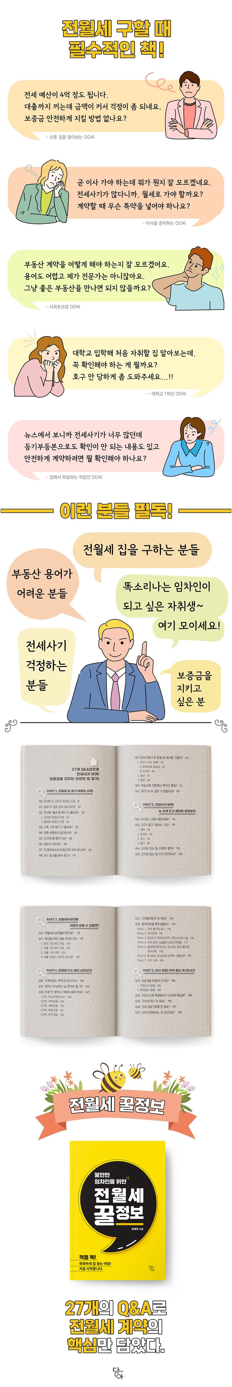 집을 구할 때 반드시 고민해야할 27개의 질문들과 그 답변들로 구성된 이 책이 전월세를 구하는 임차인들에게 전세 사기에 대한 불안을 덜어주는 든든한 가이드가 되었으면 좋겠습니다.