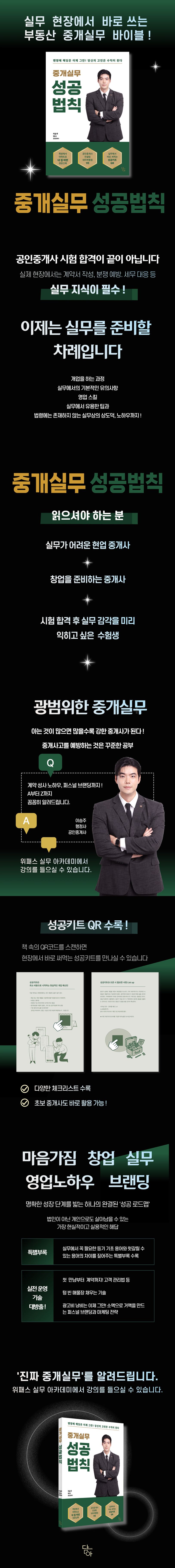 『중개실무 성공법칙』은 단순한 이론서가 아닙니다. ‘실수는 비용’이라는 이승주 강사의 철학 아래, 개업부터 첫 계약까지 실패 없는 ‘진짜 실무’의 모든 것을 알려 주는 단 하나의 가이드북입니다. 개업을 하는 과정, 실무에서의 기본적인 유의사항과 영업 스킬이 들어있습니다. 실무에 유용한 팁이나 법령에는 존재하지 않는 실무상의 상도덕, 노하우 등을 함께 수록하였습니다.