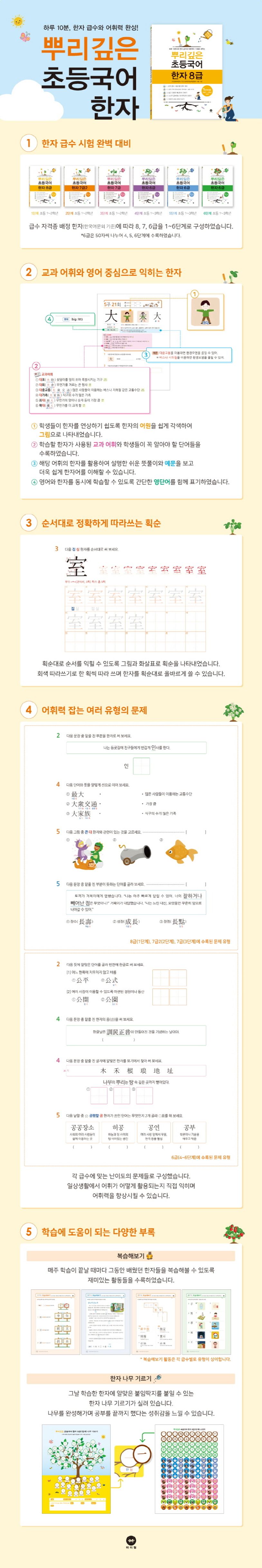 〈뿌리깊은 초등국어 한자〉는 한자 급수를 대비할 수 있는 교재입니다. 우리말에는 한자로 된 단어가 많습니다. 교과 어휘 위주로 한자를 활용하여 실제 언어생활에서 어떻게 활용되는지 파악할 수 있게 하였습니다. 이 책은 자주 쓰이는 한자 표현들을 정확하게 그 의미를 알고 활용할 수 있는 다양한 문제 유형들이 실려 있으며, 재미있는 이야기를 통해 한자를 익히는 과정에서 아이들의 배경 지식이 자연스럽게 늘어날 수 있도록 구성하였습니다.