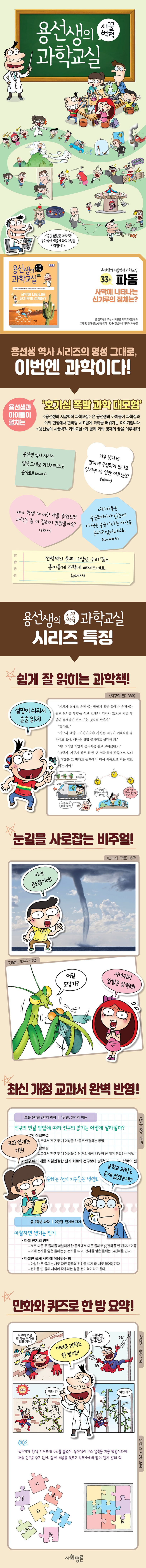 부동의 역사 베스트셀러 ‘용선생’이 새롭게 선보인 《용선생의 시끌벅적 과학교실》 시리즈 신간이 나왔습니다. 《용선생의 시끌벅적 과학교실》은 용선생과 아이들이 한바탕 시끄럽게 과학을 배워 가는 이야기입니다. 현재 아이들의 독서 습관을 고려한 쉬운 서술, 생생한 사진과 기발한 삽화로 눈길을 사로잡는 비주얼, 최신 과학 교과서를 충실히 반영한 내용 구성, 호기심을 북돋우는 소재로 풀어낸 개념과 원리 등 초등학생이 꼭 알아야 할 과학의 모든 것이 담겨 있습니다.