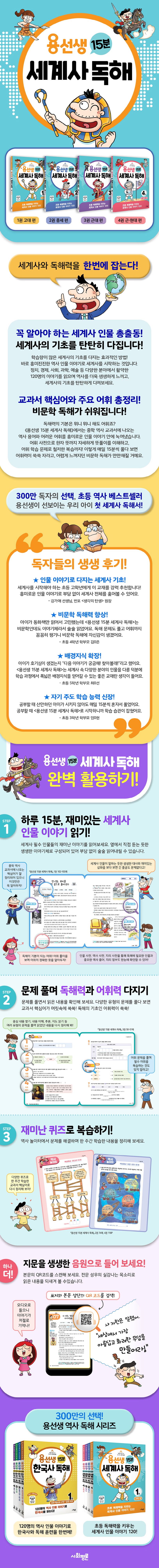 『용선생 15분 세계사 독해』는 매일 15분, 세계사 인물 이야기를 읽으며 세계사의 기초를 다지고, 비문학 독해 실력도 향상시킬 수 있는 교재입니다. 1권 고대부터 4권 근·현대까지 세계사에서 반드시 알아야 하는 필수 인물 120명을 선정했습니다. 흥미로운 인물 이야기를 통해 세계사의 흐름을 잡을 수 있도록 역사를 오랫동안 연구한 전문가가 집필했습니다. 지문을 꼼꼼히 읽었는지 확인하는 독해 학습 문제와 어휘 학습 문제도 단계별로 깐깐하게 만들었습니다. 지문과 문제는 역사 전문가와 국어 선생님의 철저한 감수를 거쳤습니다. 세계사를 생생하게 접할 수 있게 본문의 음원 자료도 제공합니다.