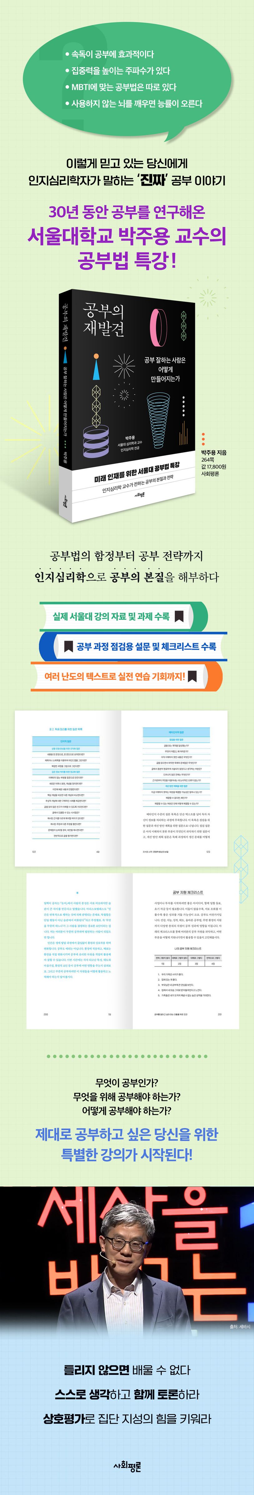 서울대 박주용 교수는 한국의 현실을 냉철하게 지적하며, 공부의 본질은 다른 곳에 있다고 말한다. 30년 넘게 공부를 연구해온 그가 전하는 ‘진짜’ 공부 이야기, 바로 『공부의 재발견』이다. 해외 저자의 번역서와 입시 성공담이 주를 이루는 인지심리학/학습 분야에서 『공부의 재발견』 출간 소식은 매우 반갑다. 이 책은 국내 인지심리학 전문가가 과학적 연구 결과를 바탕으로 쓴 거의 유일한 공부법 책이다.