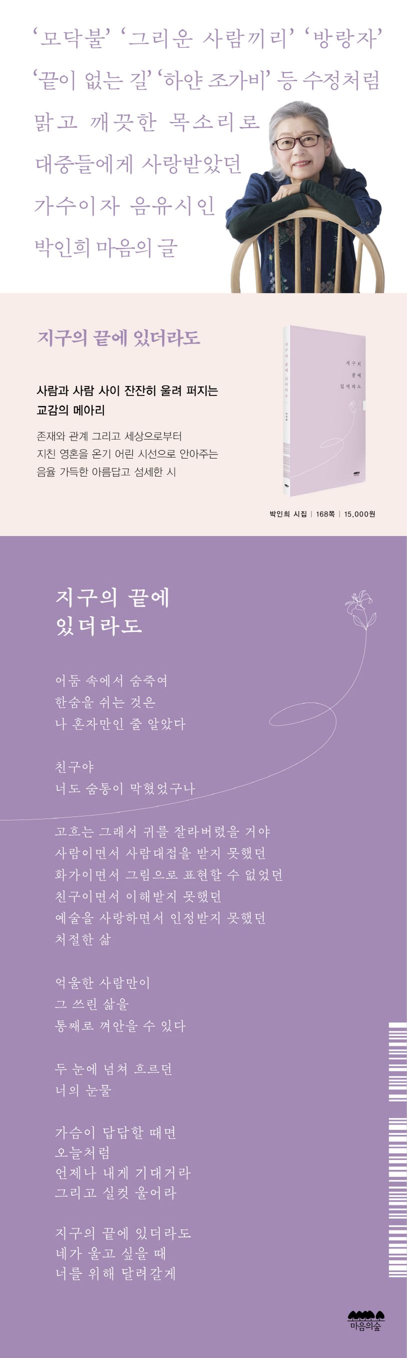 ‘모닥불’ ‘그리운 사람끼리’ ‘방랑자’ ‘끝이 없는 길’ ‘하얀 조가비’ ‘섬집아기’ 등 수정처럼 맑고 깨끗한 목소리로 많은 대중들에게 사랑받았던 가수이자 음유시인 박인희의 귀환! 흔들리는 청춘들의 로망이던 박인희를 잊지 않고 기다려 준 수많은 영혼의 낭만과 추억을 위하여 2024년 오늘 다시금 박인희만의 음율 가득한 섬세한 감성의 글이 읽는 이들을 어루만져 준다.