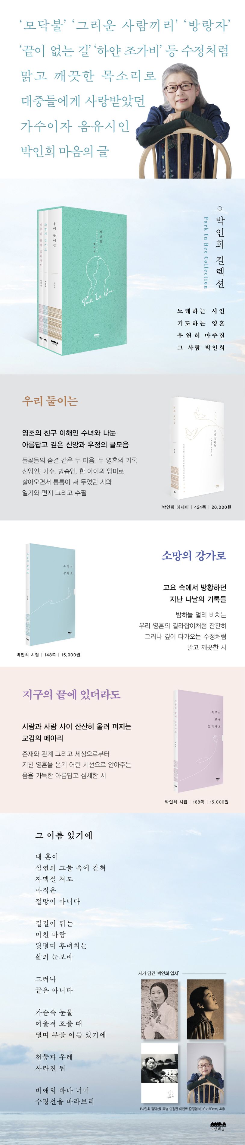 ‘모닥불’ ‘그리운 사람끼리’ ‘방랑자’ ‘끝이 없는 길’ ‘하얀 조가비’ 등 수정처럼 맑고 깨끗한 목소리로 대중들에게 사랑받았던 가수이자 음유시인 박인희의 귀환! 흔들리는 청춘들의 로망이던 박인희를 잊지 않고 기다려 준 수많은 영혼의 낭만과 추억을 위하여 2024년 오늘 다시금 박인희만의 음율 가득한 섬세한 글이 어루만져 준다.