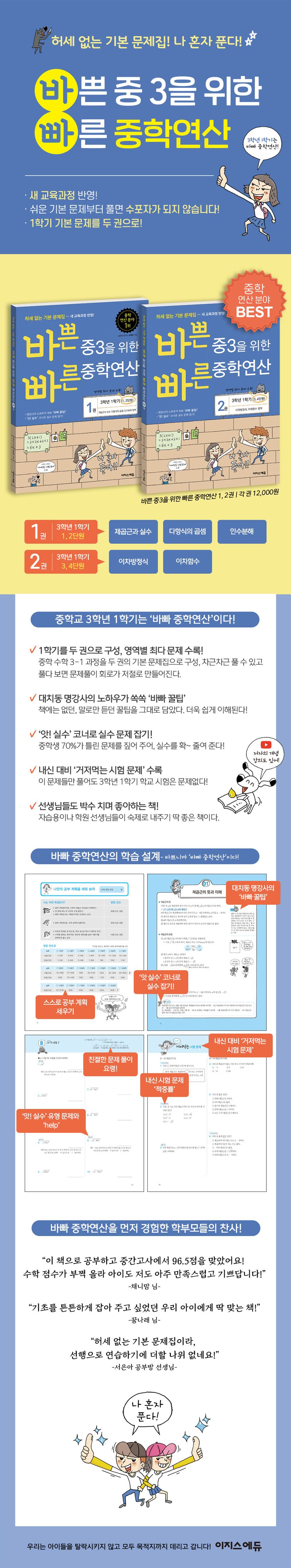 중학교 3학년 1학기 첫 번째 수학책은 혼자 풀 수 있을 만큼 쉬워야 한다. ‘바빠 중학연산’의 설명은 쉽다. 마치 눈앞에서 선생님이 얘기하는 것처럼 친절해, 학생들이 좌절하지 않고 문제를 풀어나갈 수 있다. ‘바빠 꿀팁’을 보며 혼자 풀어도 기초를 탄탄하게 다질 수 있으며, ‘앗! 실수’ 코너를 통해 중학생 70%가 자주 틀리는 실수 포인트를 정리할 수 있다. 마지막으로 ‘거저먹는 시험 문제’ 코너에 시험에 꼭 나오는 기본 문제와 ‘적중률’을 수록, 중학교 3학년 1학기에는 이 책만 풀어도 학교 시험까지 대비된다.