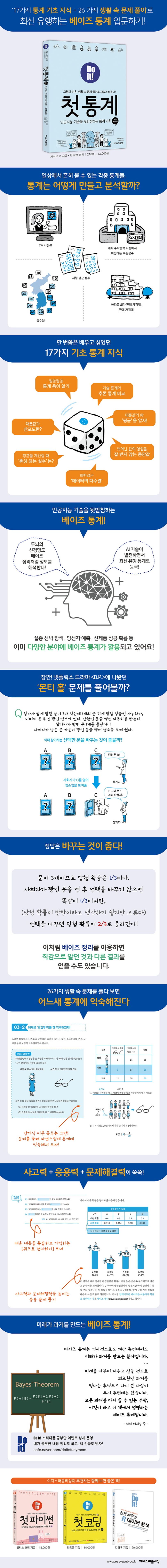 인공지능 시대, 통계 입문에 적합한 책이 나왔다! 『Do it! 첫 통계 with 베이즈』는 생활 속 문제를 해결하면서기초 통계의 개념부터 최신 베이즈 통계 이론을 재미있게 배울 수 있다. 일본의 한 중학교에서 성적 최하위 반을 맡아우수반 평균 이상의 성적을 내도록 가르쳐 유명해진 수학전문 교사 사사키 준이 집필한 책의 국내 번역서다.