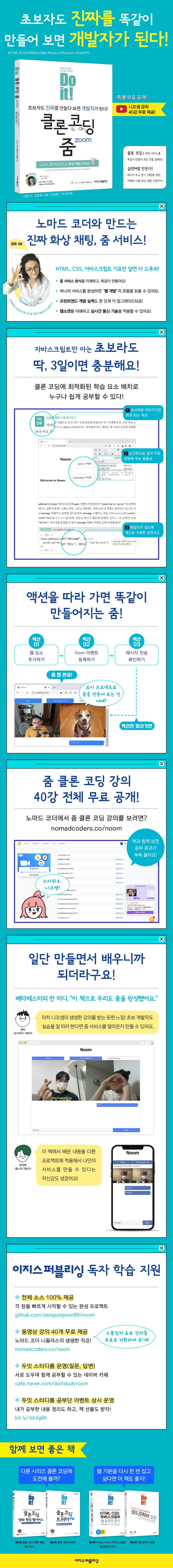이 책은 클론 코딩 시리즈의 세 번째이자, 화상 채팅 서비스인 줌(Zoom)을 똑같이 만들어 본다. 웹 소켓을 이용한 실시간 메시지 교환, 채팅룸 생성, 그리고 실시간 화상 채팅까지 줌의 핵심 서비스를 똑같이 구현한다. 그야말로 진짜 서비스를 만드는 것이다.