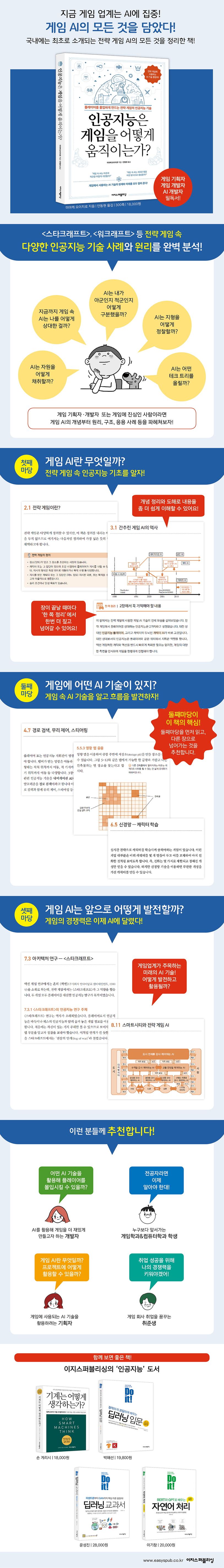 이 책은 크게 전략 게임 속 AI가 무엇인지, 전략 게임에 사용한 AI 기술은 무엇인지, 앞으로 전략 게임 속 AI 기술이 어떻게 발전하고 다른 분야에 어떻게 활용될 것인지 등 게임 속 AI의 과거, 현재, 미래를 설명합니다. 심층 학습의 등장과 인공지능의 붐으로 더욱 발전하게 된 게임 AI의 현재 모습을 알고, 앞으로의 게임 산업과 인공지능의 미래를 준비하는 데 도움이 될 것입니다.