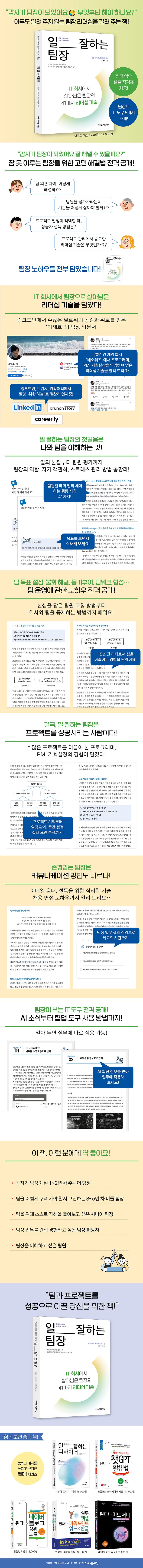 《일 잘하는 팀장》은 신임 팀장에게 필요한 모든 것을 담았습니다. 팀장의 기본 역할부터 팀 관리, 커뮤니케이션 기술에 이르기까지, 실제 경험에서 우러난 실질적인 노하우를 제공합니다. 특히 팀원에게 동기를 부여하고 팀원 간의 갈등을 해결하는 방법, 프로젝트 관리 노하우는 직장 생활에서 정말 유용하게 쓸 수 있습니다.