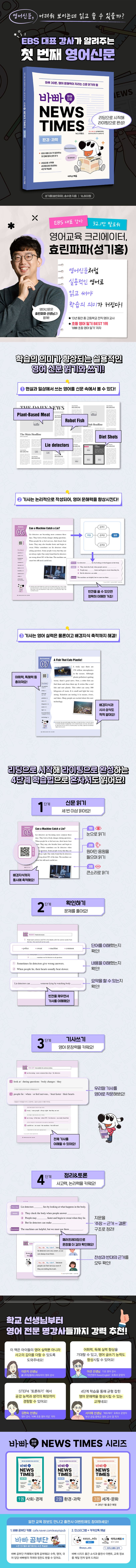 하루 30분, 영어 문해력이 자라는 신문 읽기의 힘! ‘바빠 영어 신문 NEWS TIMES - 환경, 과학 편’이 나왔다! 이 책은 EBS 대표 강사이자 13년 동안 중·고등학교 영어를 가르친 효린파파 성기홍 선생님의 노하우가 집약된 영어 신문 읽기 교재이다.