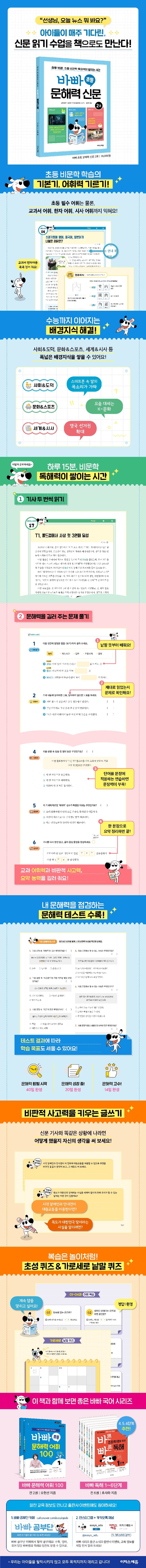 ‘바빠 초등 문해력 신문’은 한자어가 섞여 있거나 문장이 조금만 길어져도 두려워하는 아이가 흥미로운 주제의 신문 기사를 읽으며 자연스럽게 독해력을 키우는 책이다.