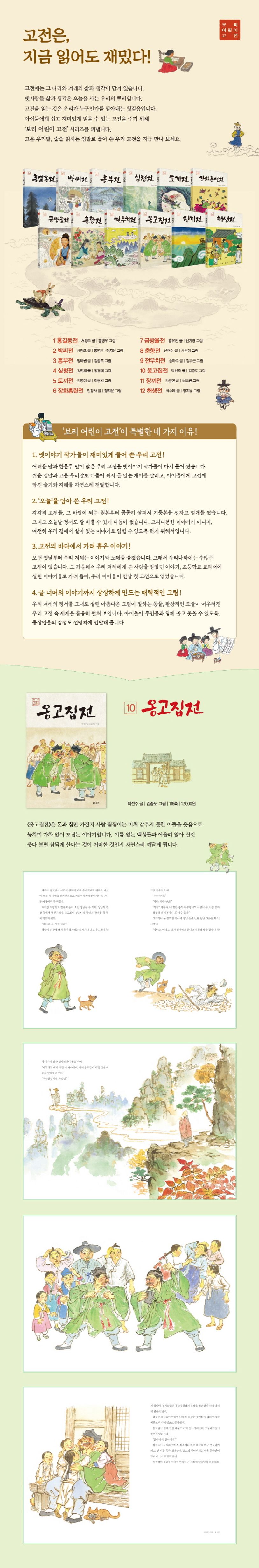 그 열 번째 이야기《옹고집전》은 웃음 속에 귀한 가르침을 담은 재미난 이야기입니다. 옹고집전》에는 진짜 옹고집과 똑같이 생긴 가짜 옹고집이 나옵니다. 이 이야기는 돈과 힘만 가졌지 됨됨이는 갖추지 못한 이들을 가차 없이 꼬집습니다. 그러면서도 정색하지 않고 웃음으로 눙칩니다. 옹고집이 새사람으로 거듭나는 모습을 실컷 웃으며 즐길 수 있습니다.