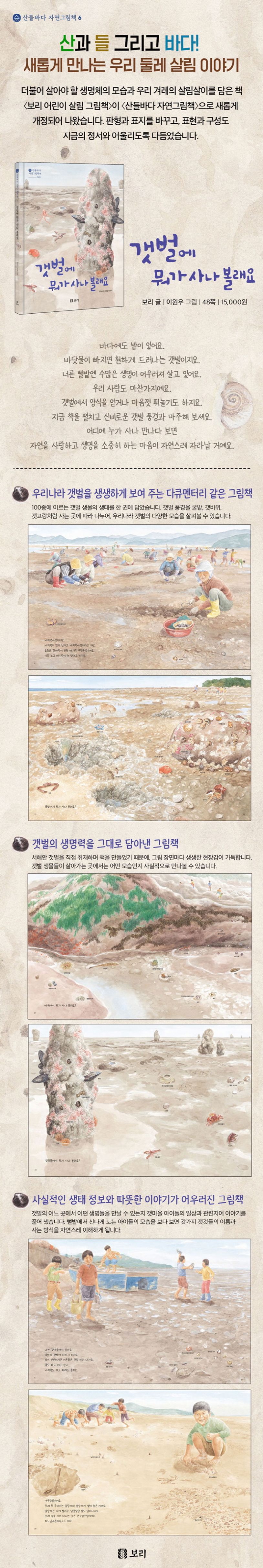 〈산들바다 자연그림책〉 시리즈의 여섯 번째 책 《갯벌에 뭐가 사나 볼래요》가 나왔습니다. 자연과 사람이 어울려 지내는 갯벌의 모습을 담은 그림책입니다. 갯벌 생태계를 비롯해 갯벌과 관계를 맺고 살아가는 사람들의 다양한 풍경을 보여 줍니다. 이 책에는 100종에 이르는 갯벌 생물의 생태가 담겨 있습니다. 바지락바탕, 굴밭, 갯바위, 갯고랑처럼 사는 곳을 나누어 갯벌 생물들의 모습을 담았습니다. 서해안 갯벌을 직접 취재하며 책을 만들었기 때문에, 그림 장면마다 생생한 현장감이 가득합니다.