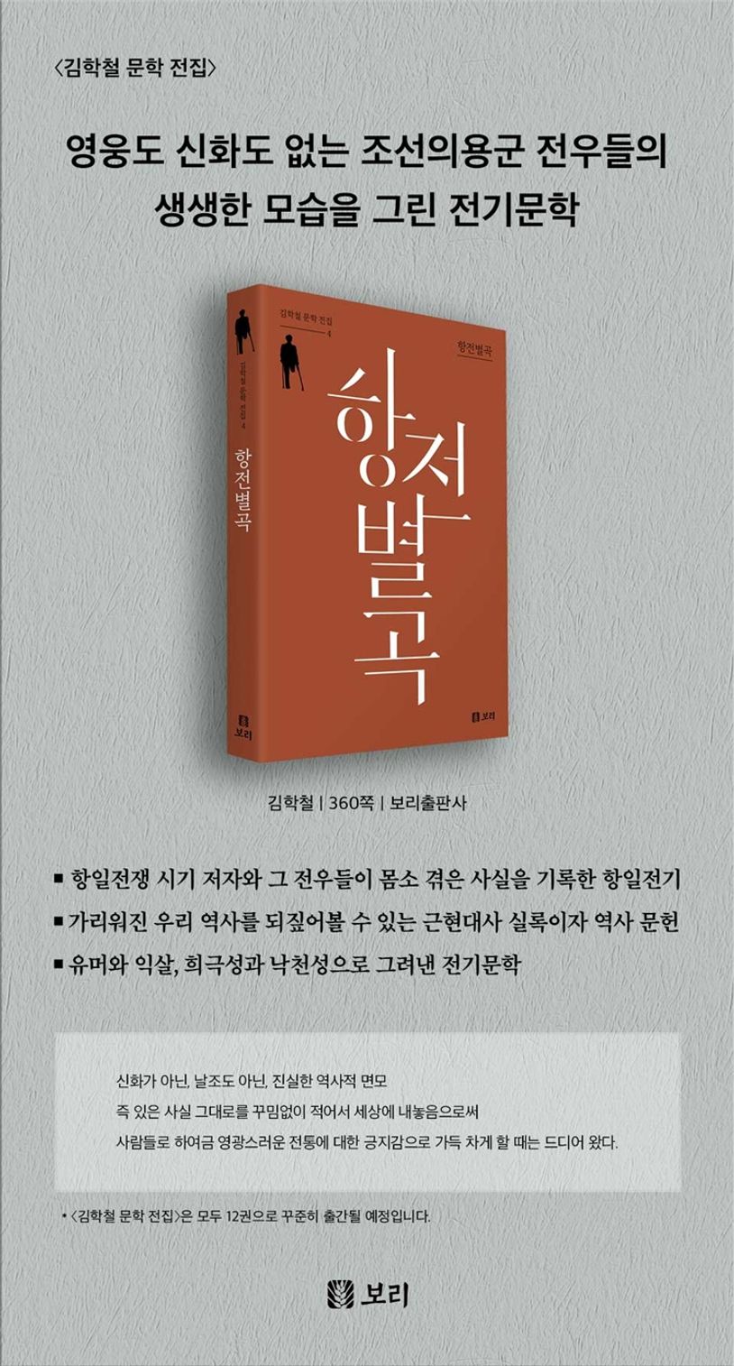 〈김학철 문학 전집〉 넷째 권은 전기문학 《항전별곡》이다. 항일독립운동 시기 조선의용군 대원인 저자와 그 전우들이 몸소 겪은 일을 모두 다섯 편의 글로 기록했다. 영웅도 신화도 없는 사실 그대로를 꾸밈없이 적은 기록 문학이자 우리 민족의 역사인 셈이다. 원본 글과 함께 역사 인물들의 기록 사진을 본문에 실었고, 부록으로 역사 인물과 사건에 대한 설명을 함께 실어 오늘날 그 당시 조선의용군 활동을 알고 싶은 독자들의 이해를 도왔다. 독립운동의 중요한 사료로써 그 가치가 충분한 책이다.